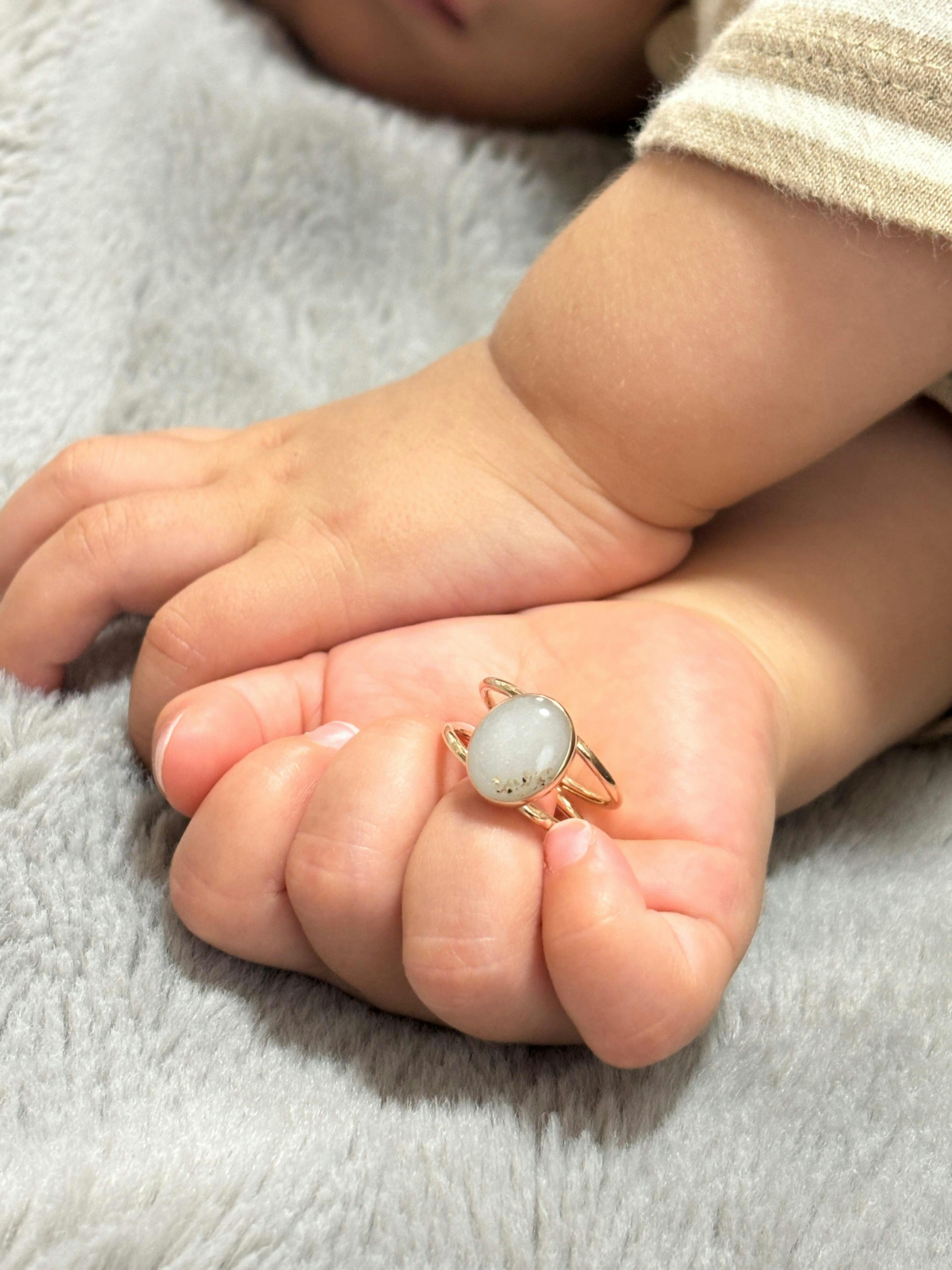 自分の誕生日プレゼントとして買ってもらいました。産後は自分のことは後回しで物欲もなく、欲しいものが浮かばなかった私。真っ先に浮かんだのが、母乳ジュエリーでした。受け取った時、自然と涙が出てきました。ちゅるっとして可愛い♡初めての家族旅行で婚約指輪と結婚指輪と共に家族の宝物として、着けて旅行出来て嬉しかったです。